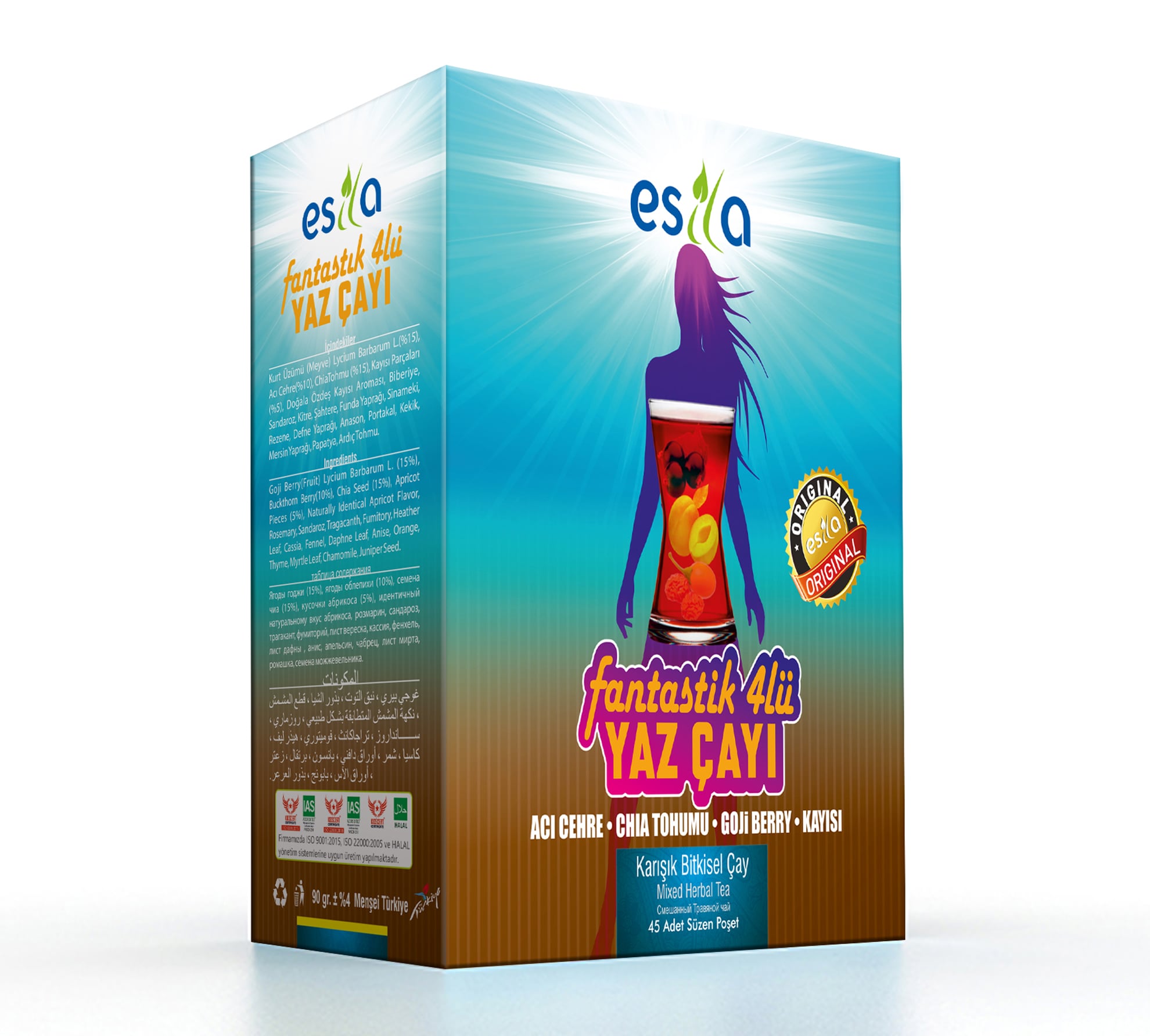 Kurt Üzümü (Meyve) Lycium Barbarum L.(), Acı Cehre(), ChiaTohmu (), Kayısı Parçaları (%5), Doğala Özdeş Kayısı Aroması, Biberiye, Sandaroz, Kitre, Şahtere, Funda Yaprağı, Sinameki, Rezene, Defne Yaprağı, Anason, Portakal, Kekik, Mersin Yaprağı, Papatya, Ardıç Tohmu.